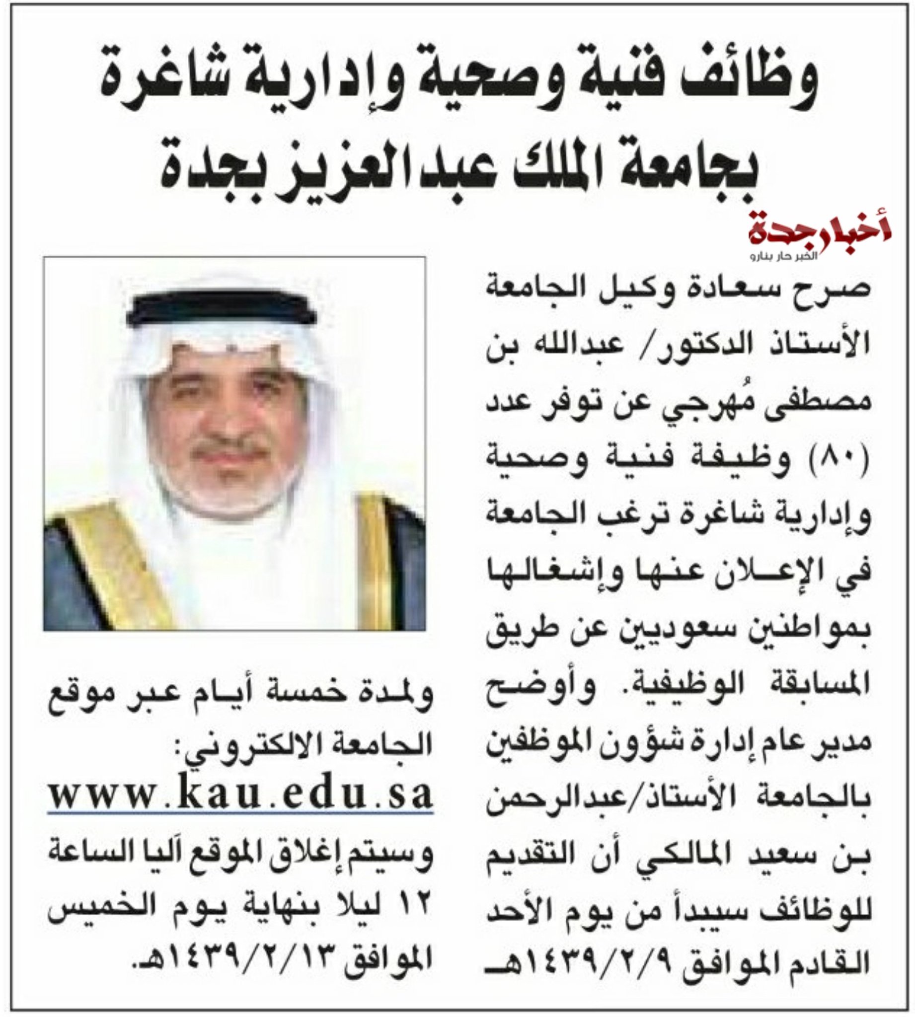 أخبار جدة Jeddah News On Twitter جامعة الملك عبدالعزيز في جدة تعلن عن توفر 80 وظيفة شاغرة فنية صحية وإدارية ترغب إشغالها بموظفين سعوديين عن طريق المسابقة الوظيفية Https T Co Gzztme8c03