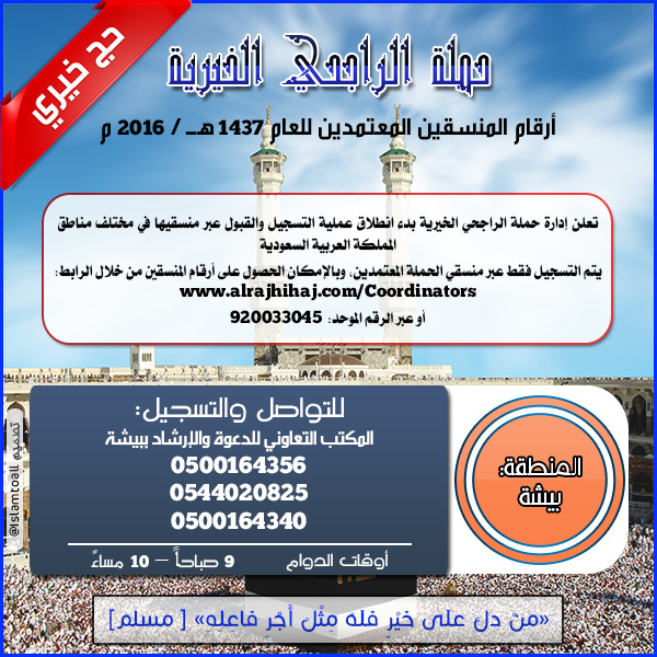مدونة الباشق الإسلامي للتعريف بالإسلام حصري ا أرقام المنسقين في حملة الراجحي الخيرية لموسم حج 1437 هـ