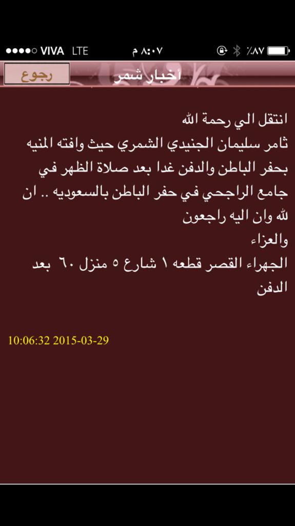 شمر الكويت الرسمي On Twitter انتقل الي رحمة الله ثامر سليمان الجنيدي وافته المنيه بحفر الباطن والدفن غدا بعد صلاة الظهر جامع الراجحي في حفر الباطن Http T Co 1ya0vwhvmt